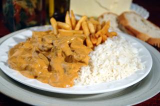 Tradicional Strogonoff Villa Felice servido com Arroz e Batata Frita ou Palha.