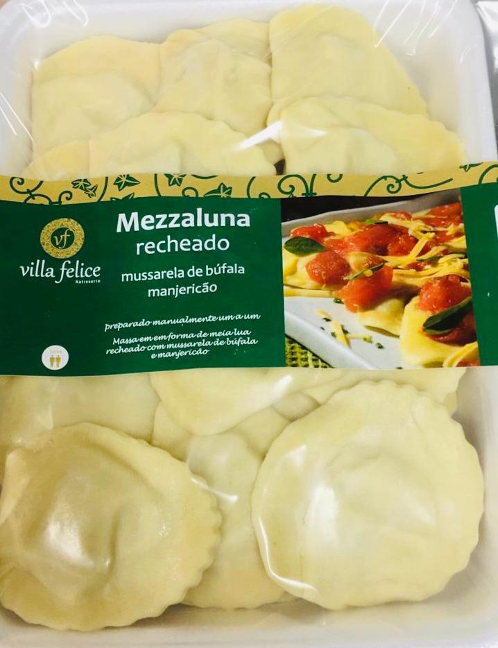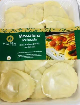 Massa em formato de meia lua recheada de mussarela de búfala e manjericão.