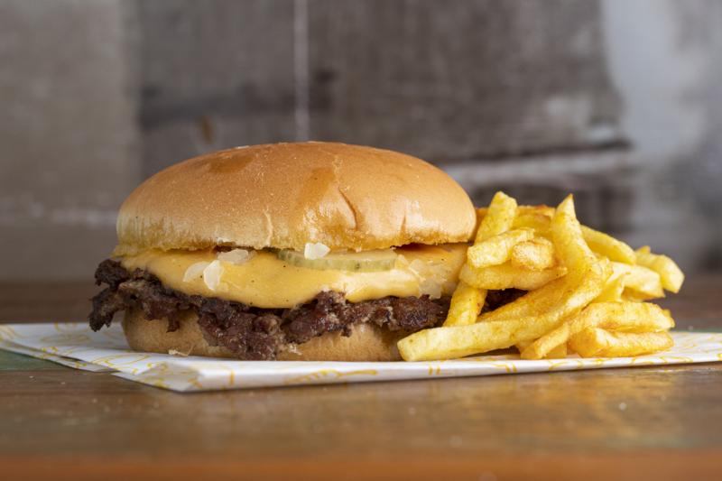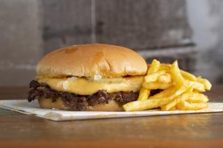 Dois smahs burgers com americam cheese derretido, pickes, cebola, catchup e mostarda + 2 acompanhamentos