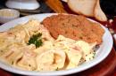 Peito de Frango à Milaneza servido com Torteloni recheado com Mussarela de Búfala ao molho cremoso com toque de vinho branco e alho.